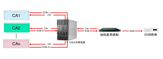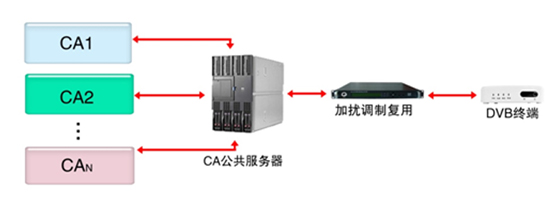 具體措施是,將多個(gè)CA服務(wù)器與一臺(tái)公共的匯聚服務(wù)器相連,與匯聚服務(wù)器連接的CA數(shù)量可不受限制,然后這臺(tái)公共的匯聚服務(wù)器再以用一個(gè)CA的身份與加擾機(jī)相連,即使與匯聚服務(wù)器連接的CA很多,對(duì)于加擾機(jī)而言,仍然是一個(gè)CA連接。這樣,引入下載CA 的數(shù)量就不再受到限制,運(yùn)營(yíng)商可以借助CA公司之間的競(jìng)爭(zhēng)提升運(yùn)營(yíng)能力。