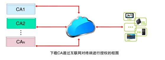 解決的辦法是采用公用CA加密ID,消除同密CA數(shù)量限制,通過(guò)互聯(lián)網(wǎng)授權(quán),消除授權(quán)和反授權(quán)控制信息阻塞。