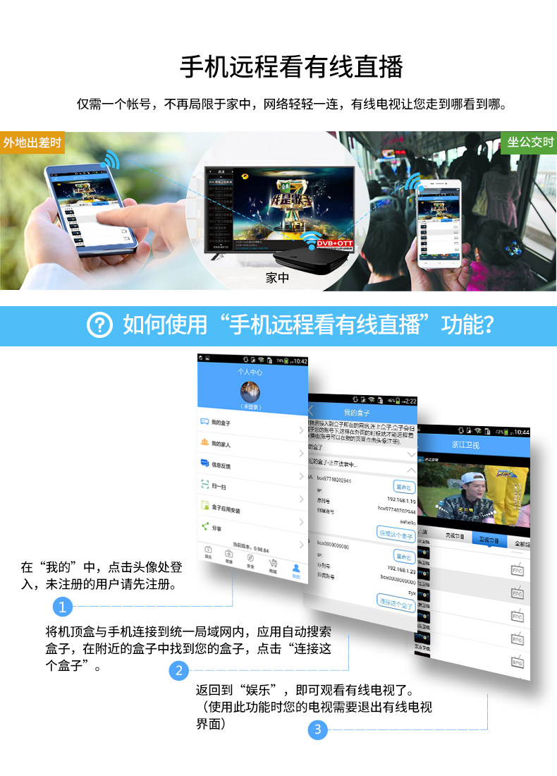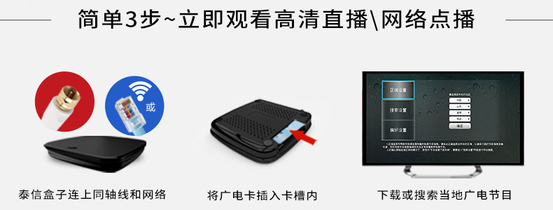 每臺(tái)泰信盒子連接廣電有線信號(hào),并連接到家中的寬帶網(wǎng),將一張正常繳費(fèi)的廣電智能卡插入其中一臺(tái)泰信盒子,其它的泰信盒子無需插卡就可以收看有線電視節(jié)目,且可獨(dú)立換臺(tái),相互不受影響。