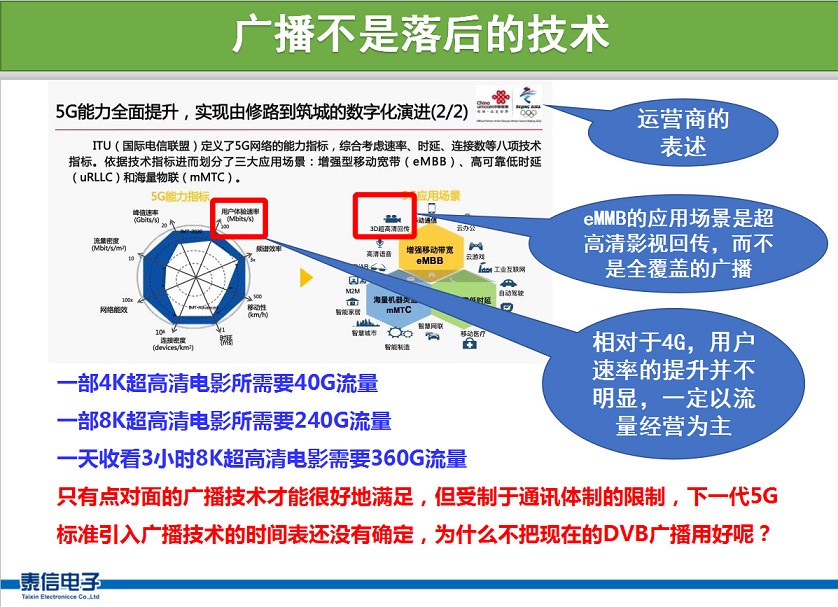 的確,5G模塊的提供者或一些賣機頂盒的人就是這么想的。但5G畢竟是無線傳輸,永遠(yuǎn)沒有有線傳輸可靠,所以重要直播事件,比如春晚、大閱兵還是需要大量的線纜與5G并行保障。在向每個家庭傳輸?shù)臅r候,也是同樣的道理,有線比無線更可靠、成本更低。