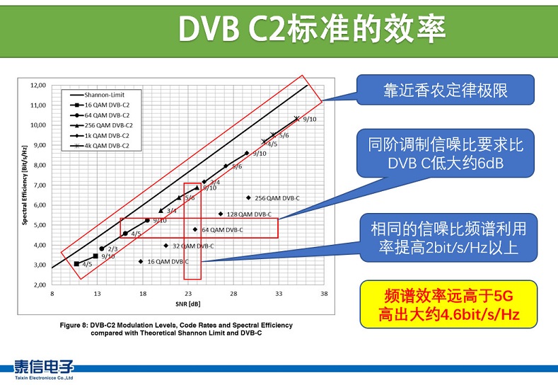DVB C2的4096QAM調(diào)制效率也遠(yuǎn)高于5G的256QAM,與現(xiàn)在普遍使用的DVB C標(biāo)準(zhǔn)相比可提升1倍數(shù)據(jù)帶寬,是可與現(xiàn)有DVB C同網(wǎng)傳輸、可立即實施的技術(shù)。