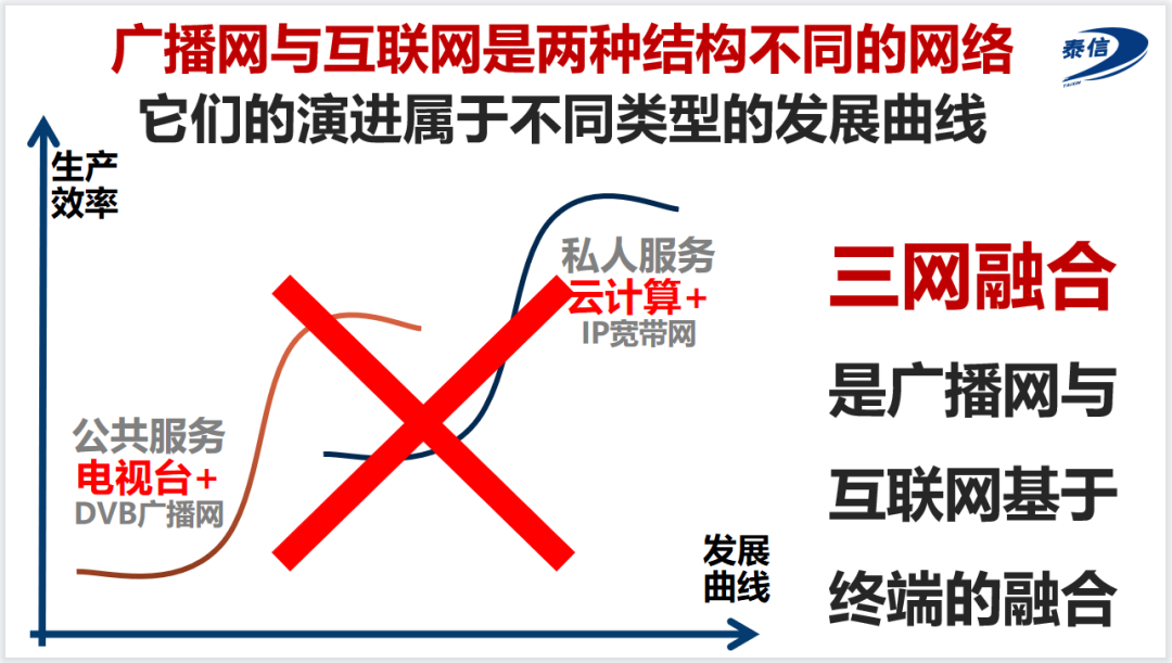 廣播網(wǎng)是以電視臺(tái)為中心的點(diǎn)對(duì)面的公共服務(wù),互聯(lián)網(wǎng)則是以各種云計(jì)算為中心的點(diǎn)對(duì)點(diǎn)的私人服務(wù),二者有各自的應(yīng)用場(chǎng)景,在社會(huì)功能上各有不同,是兩種結(jié)構(gòu)不同、有各自的優(yōu)缺點(diǎn)、不能互相代替的網(wǎng)絡(luò),不存在相互迭代關(guān)系,只能基于終端融合發(fā)展。