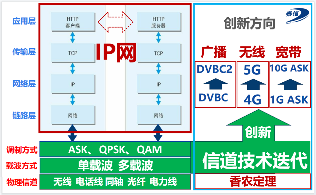 該圖中標(biāo)識(shí)了IP協(xié)議在網(wǎng)絡(luò)中的位置,它位于基礎(chǔ)信道技術(shù)之上,是屏蔽了信道差異性、與信道無(wú)關(guān)的互聯(lián)網(wǎng)通信協(xié)議。綠色部分是網(wǎng)絡(luò)技術(shù)的創(chuàng)新方向。3-5G、WiFi、光纖通信等技術(shù),都是在這個(gè)方向上進(jìn)行創(chuàng)新,目的是盡量高效地利用物理信道。