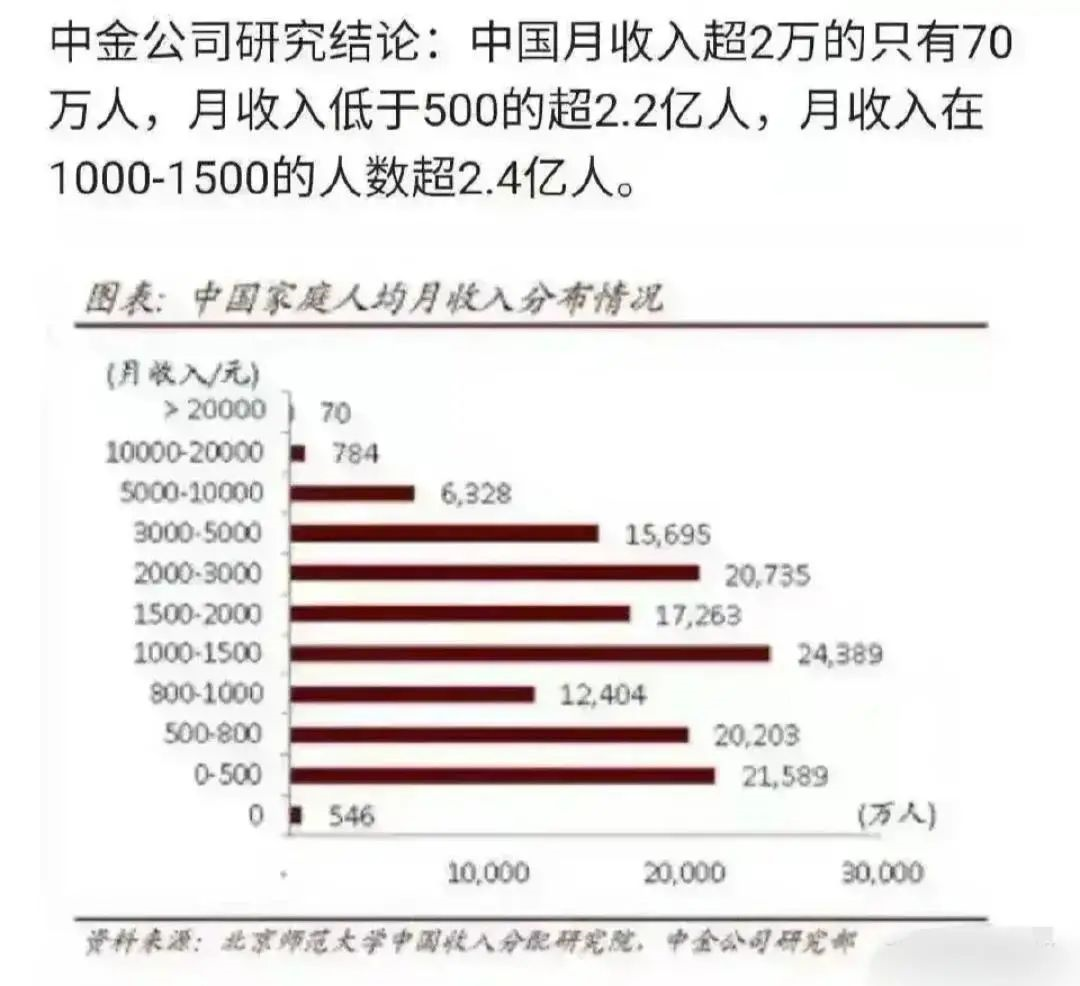 我國(guó)家庭人均月收入低于800元的竟然有4.18億,有些讓人詫異。記得有領(lǐng)導(dǎo)說(shuō)過(guò),我國(guó)有6億人月收入低于1000元,看來(lái)是準(zhǔn)確的。