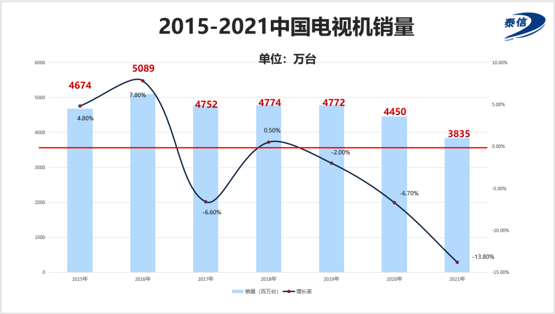 國內(nèi)電視機銷量在2021年下降了13.8%,但銷售額卻增長了6.6%。主要原因是43寸以下的低價機型出貨比例下降,65寸以上的大尺寸電視出貨比例增加。